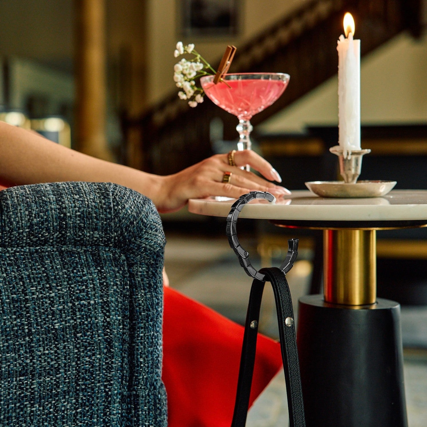 Attaché is a chic compliment to your handbag that keeps your purse within arms reach wherever you go. Hate it when your gorgeous bag touches the dirty floor of a restaurant - or worse, the women’s restroom? Simply hook it to Attaché and protect your purse from dirt, water and whatever else is down there. We’ve even designed an array of beautiful metal finishes to match any handbag you own.